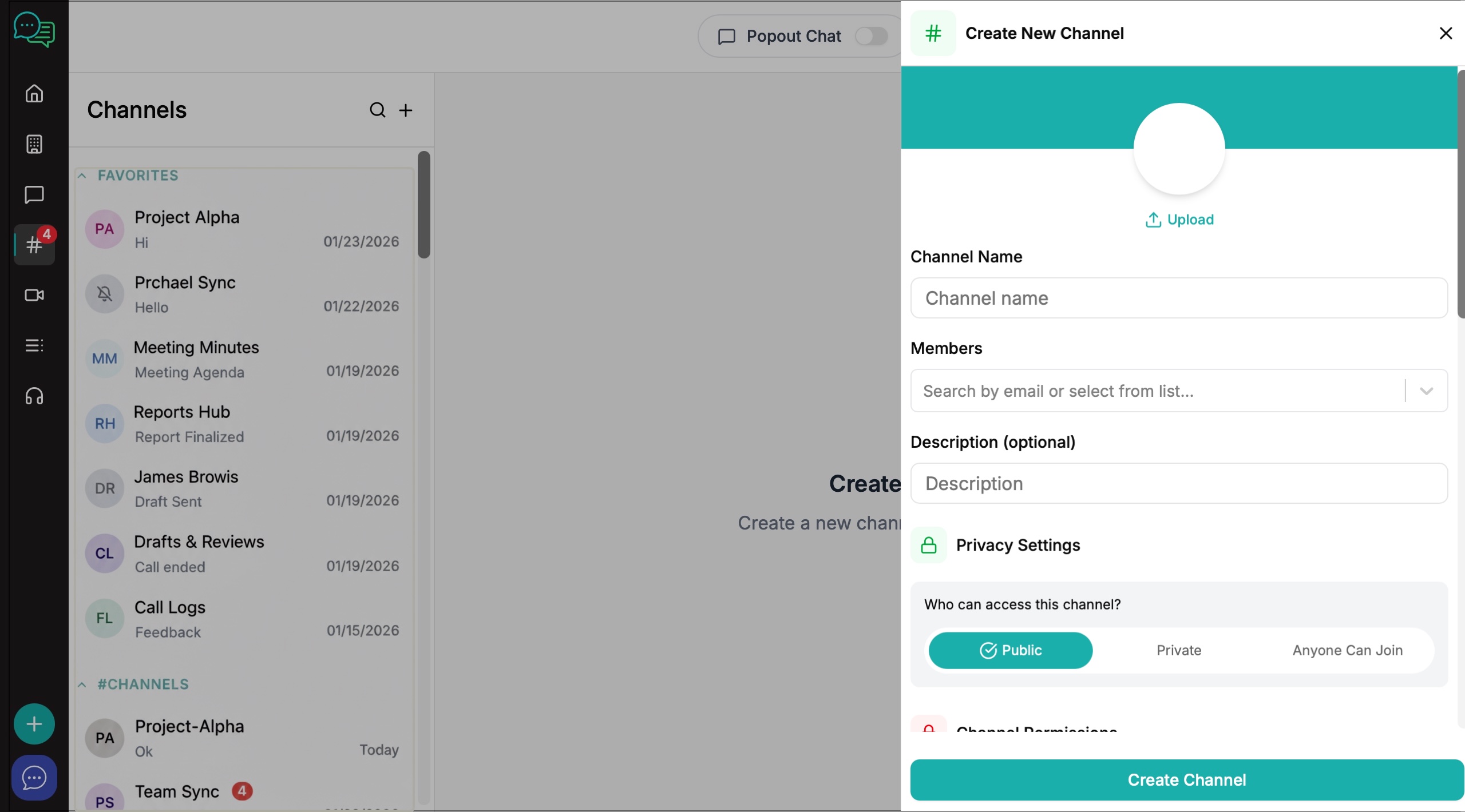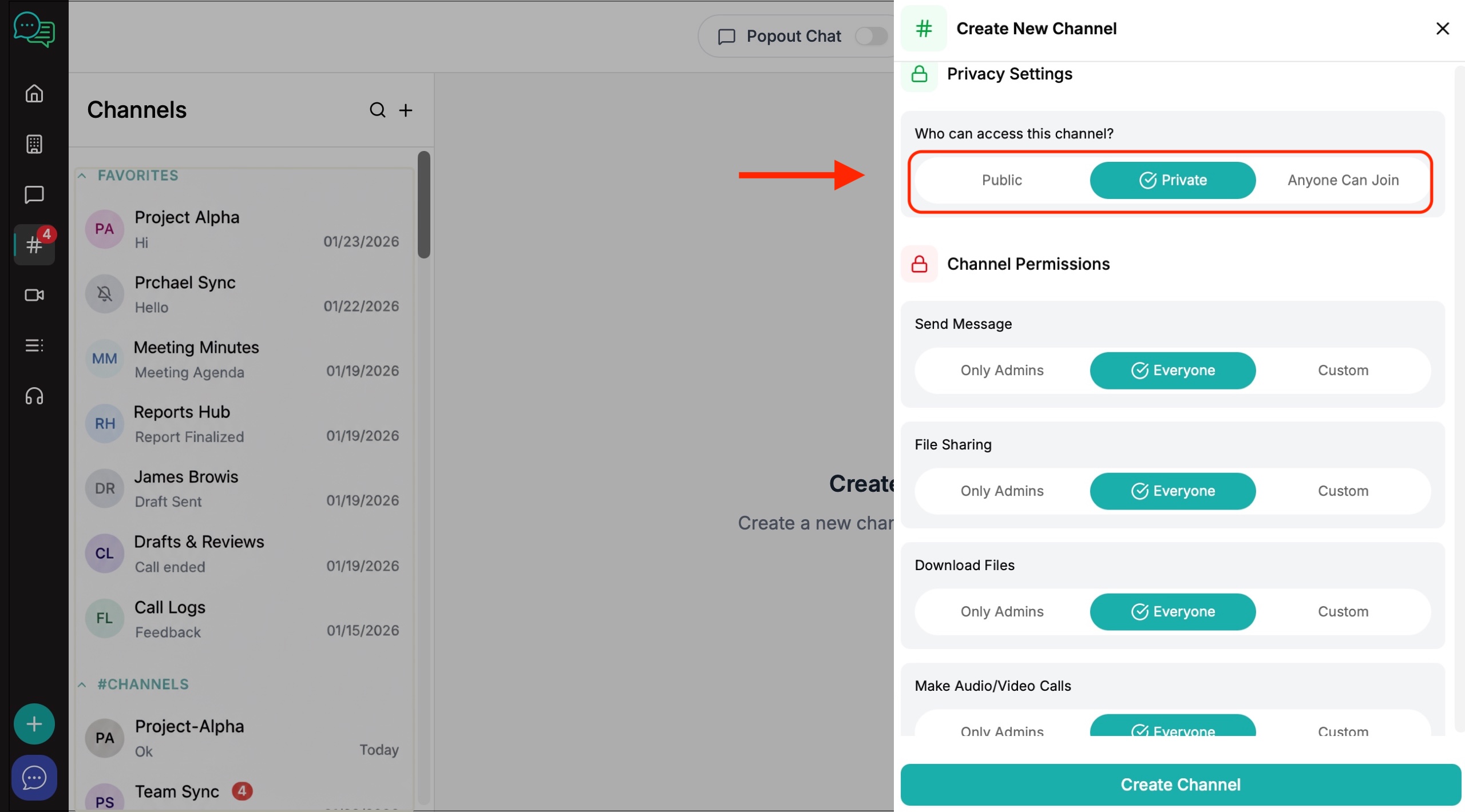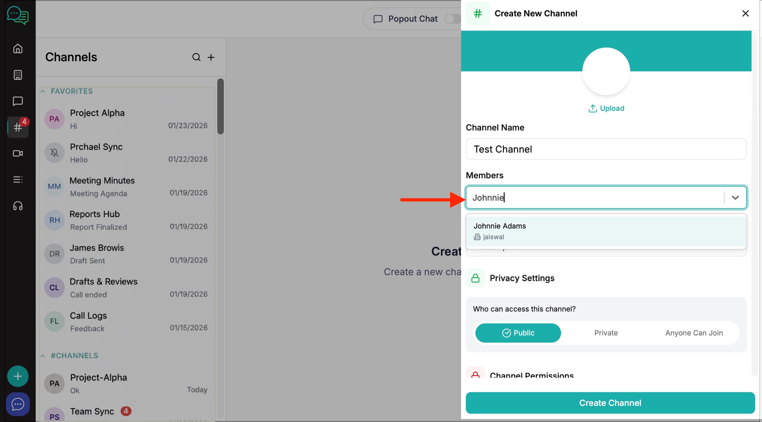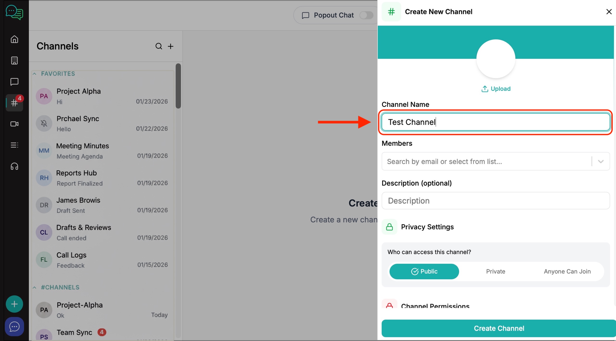 6. The channel creation window will appear on the right. Create your channel name, invite members and decide on the level of privacy and channel permissions you want to give to members.