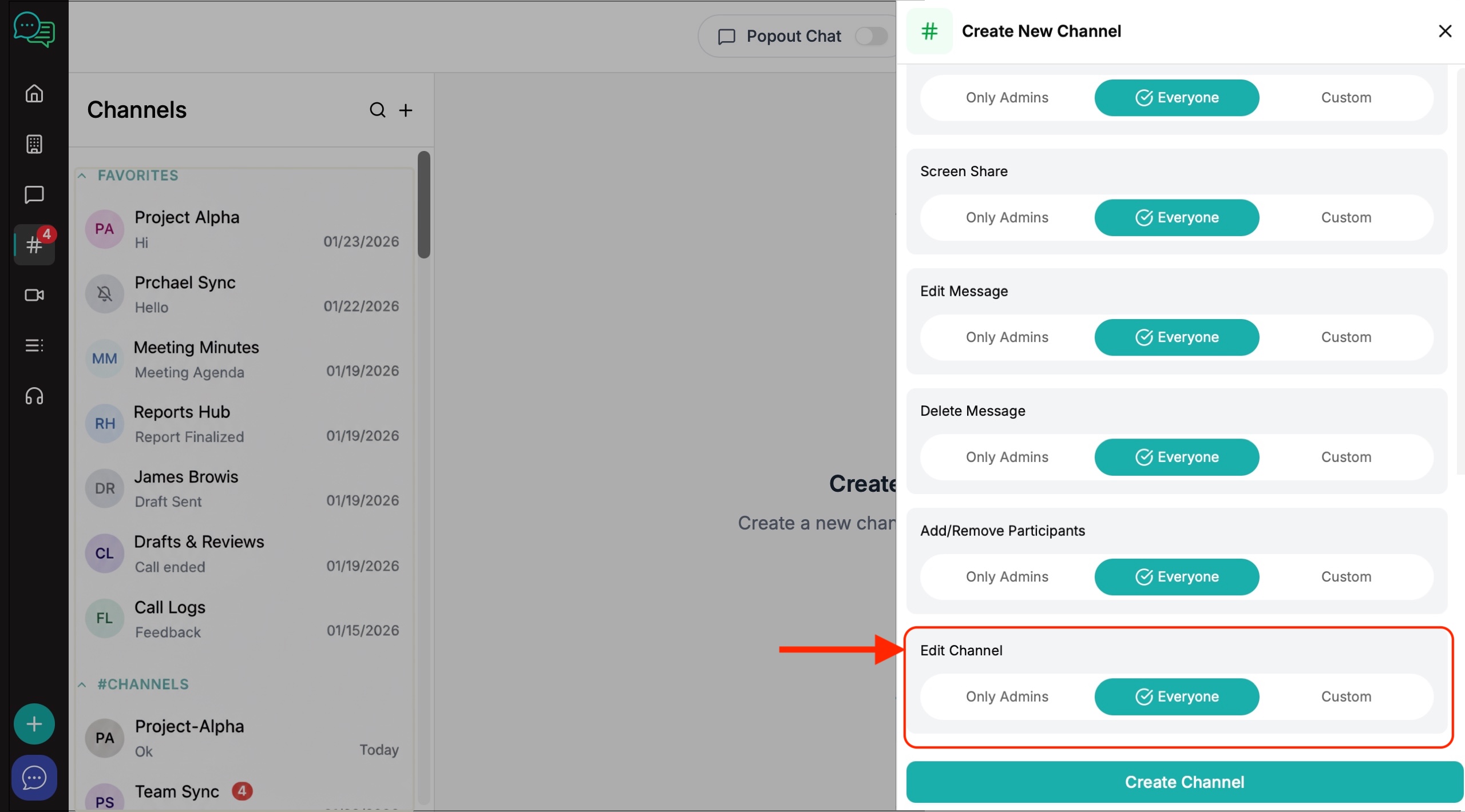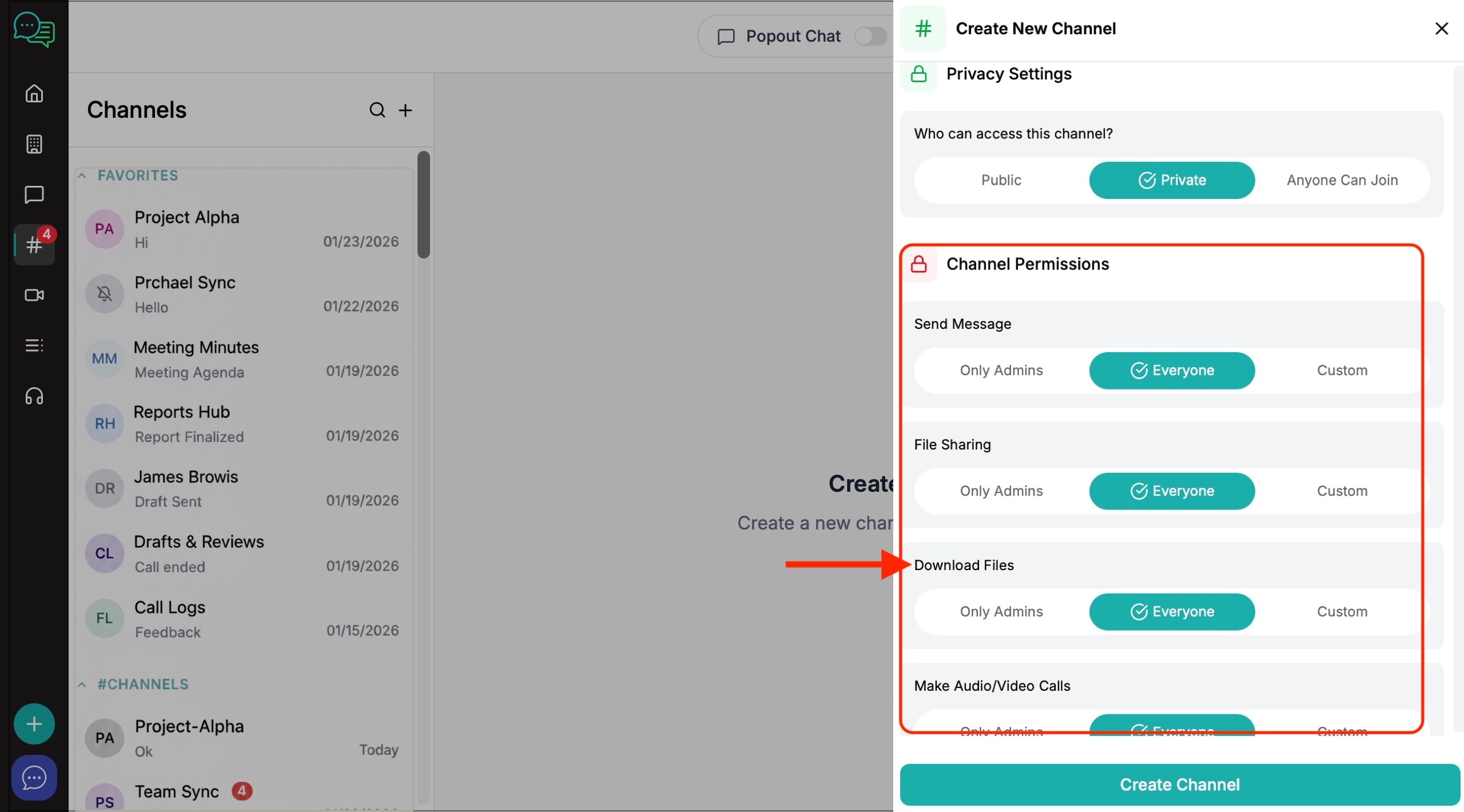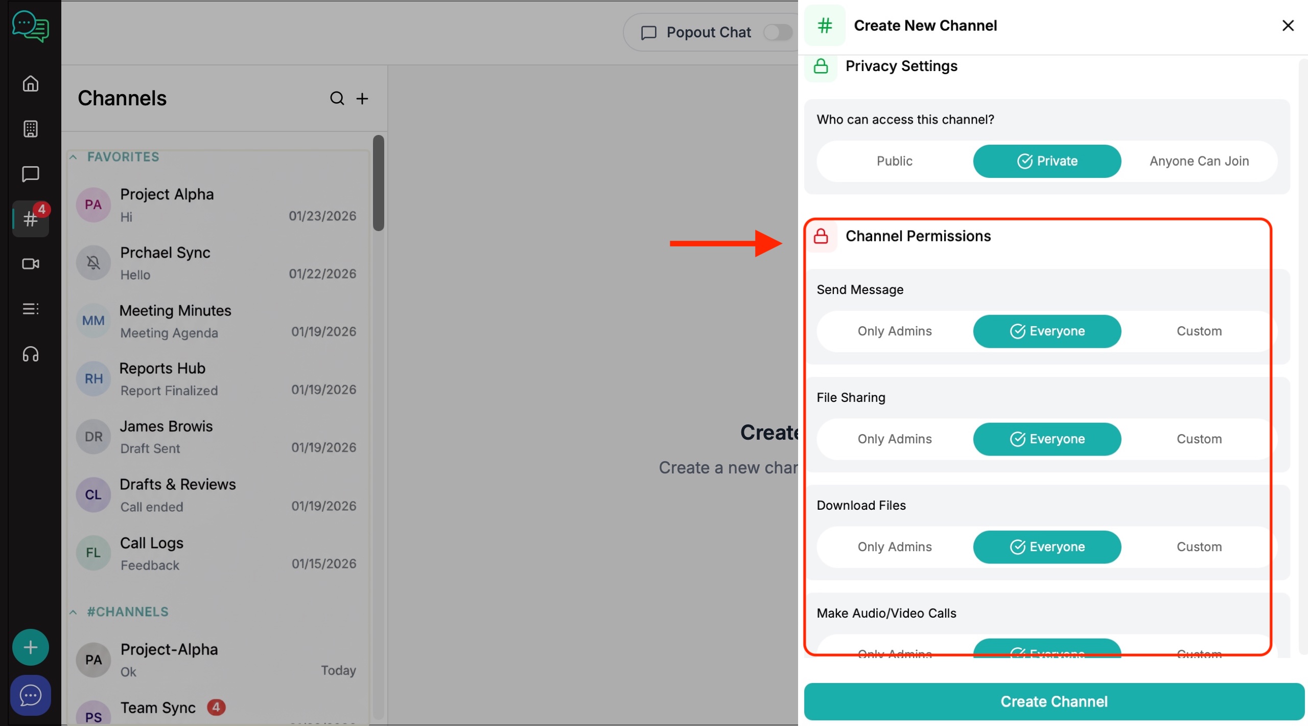 6. The channel creation window will appear on the right. Create your channel name, invite members and decide on the level of privacy and channel permissions you want to give to members.