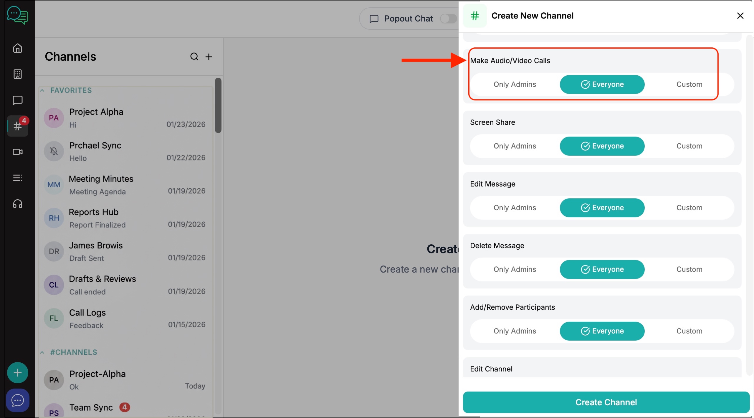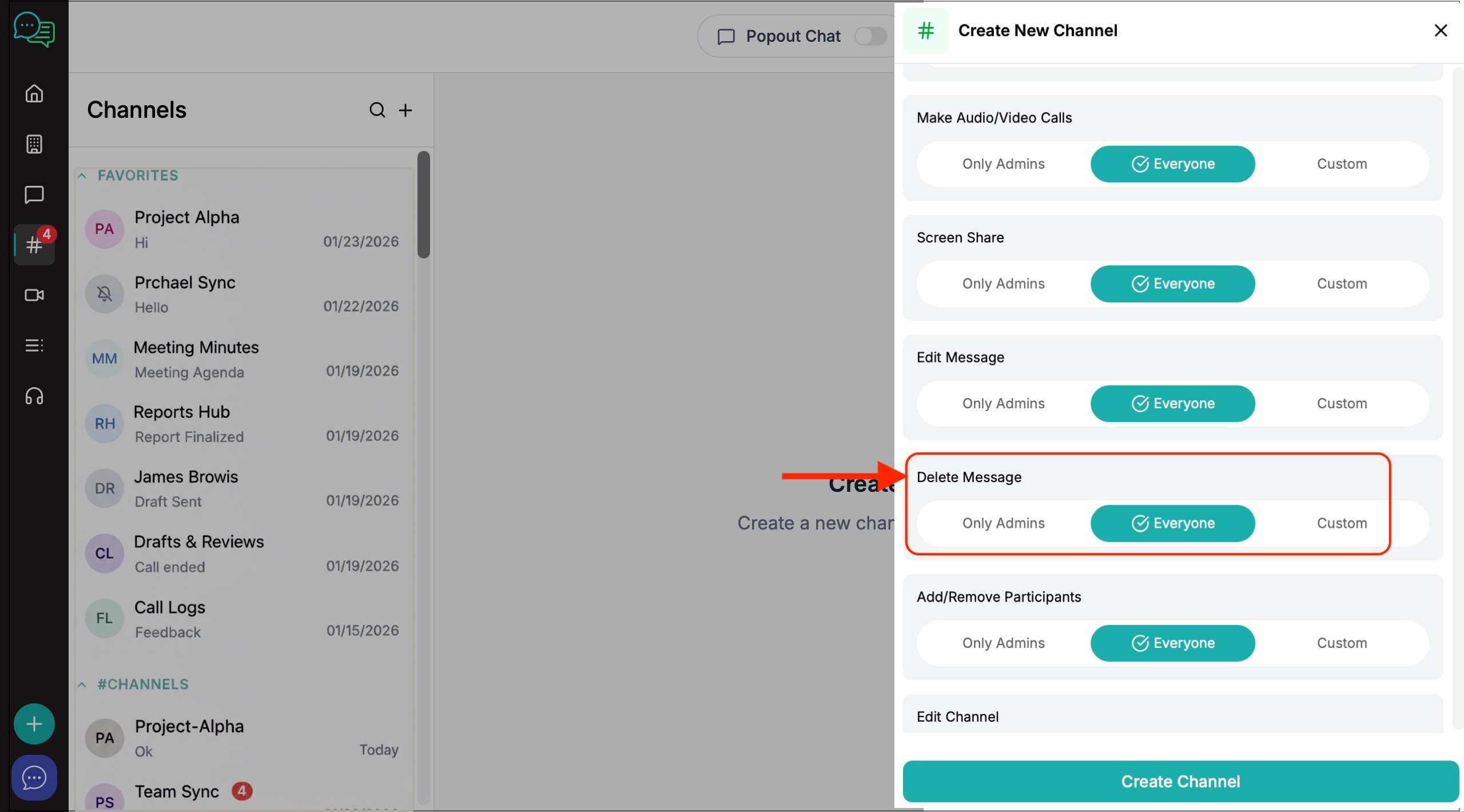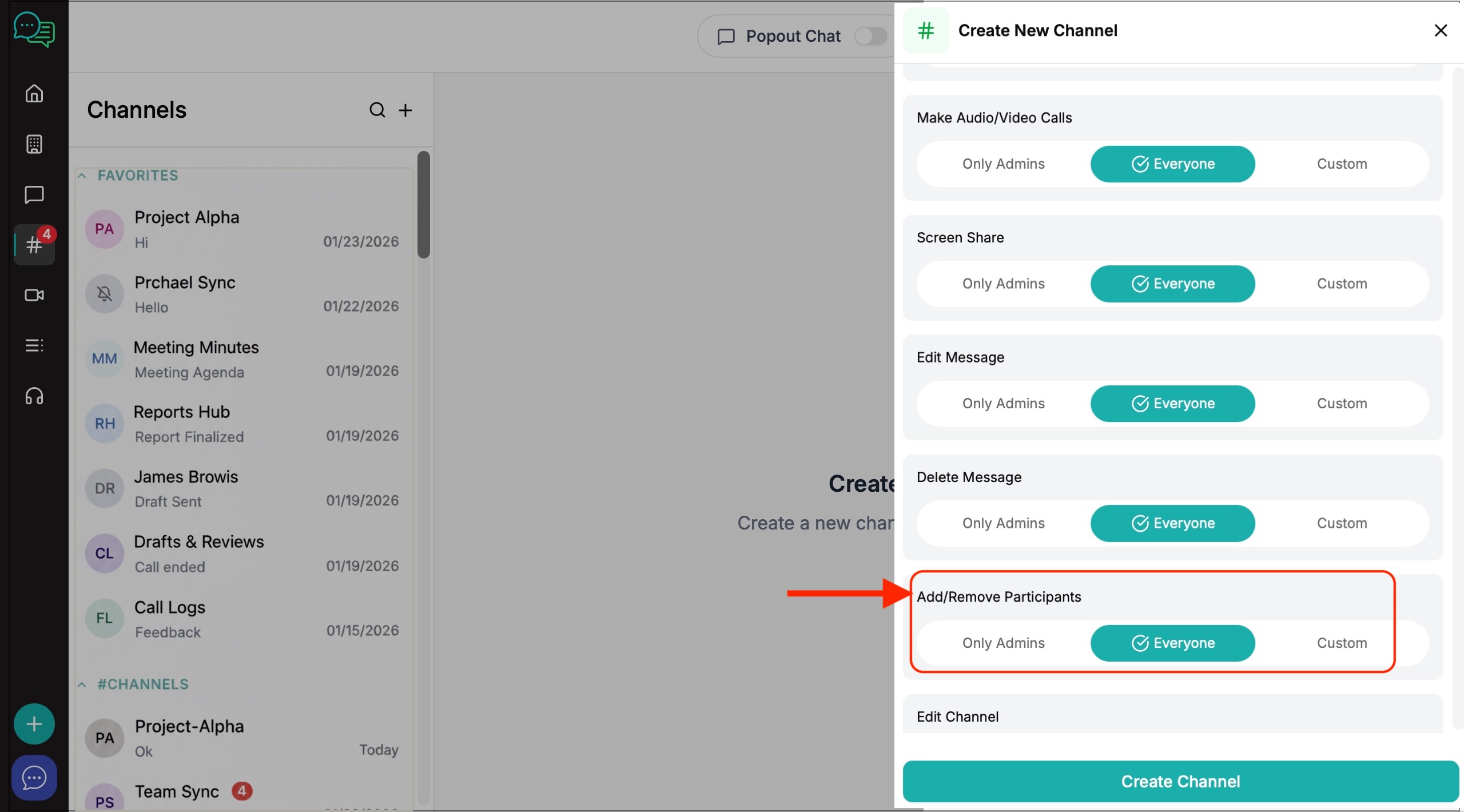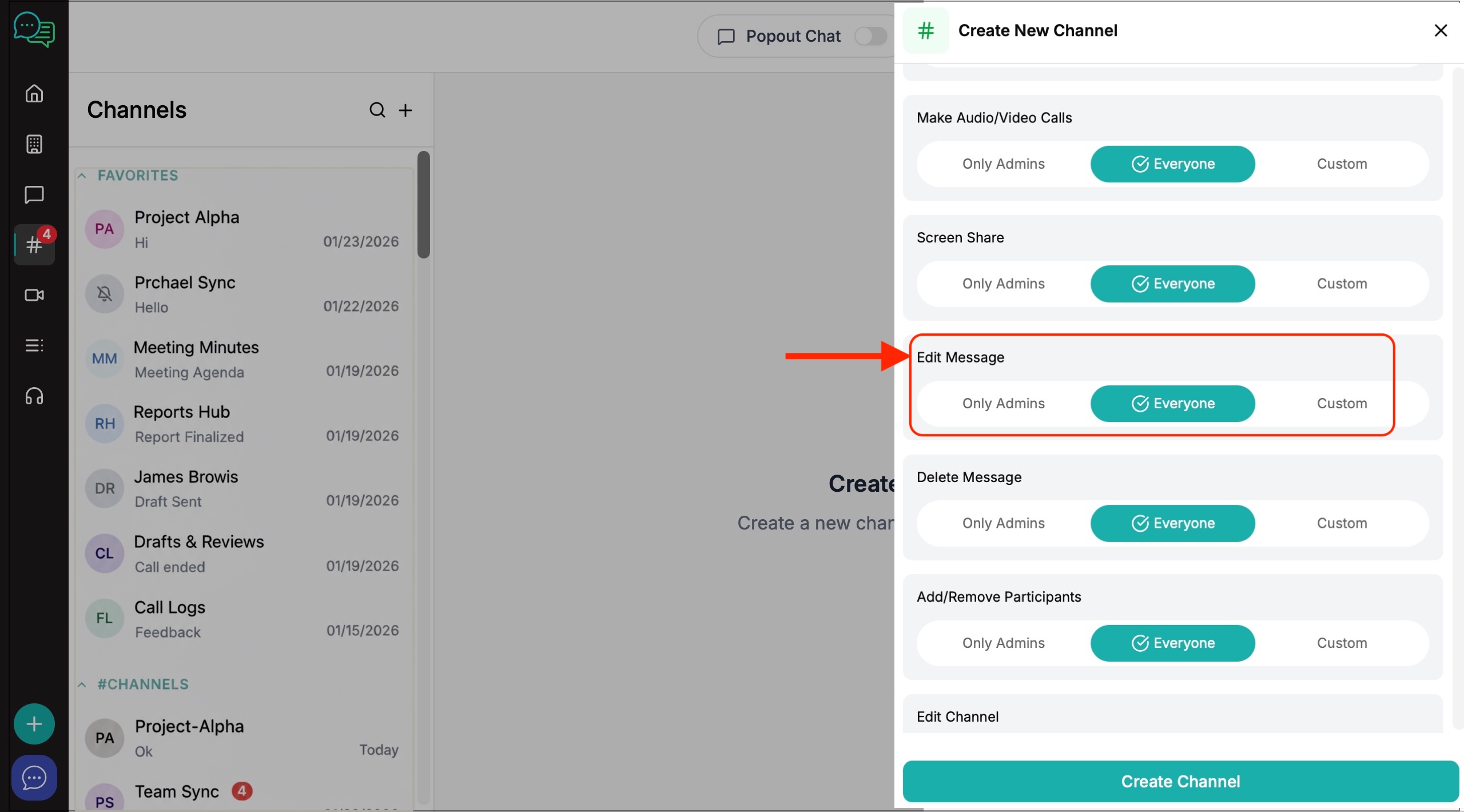 6. The channel creation window will appear on the right. Create your channel name, invite members and decide on the level of privacy and channel permissions you want to give to members.