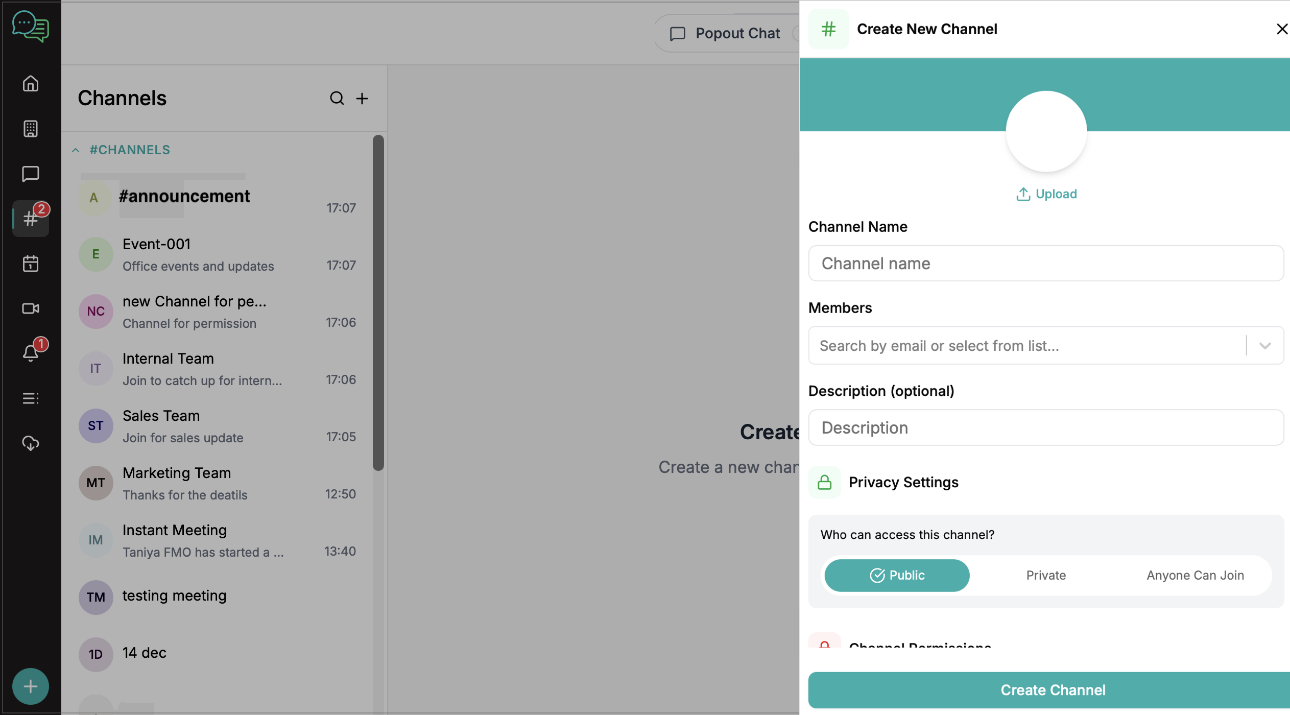 At the top, optionally upload an image to visually represent the channel. Then enter a Channel Name, add Members by searching their email or selecting from the list, and type a short Description if needed.