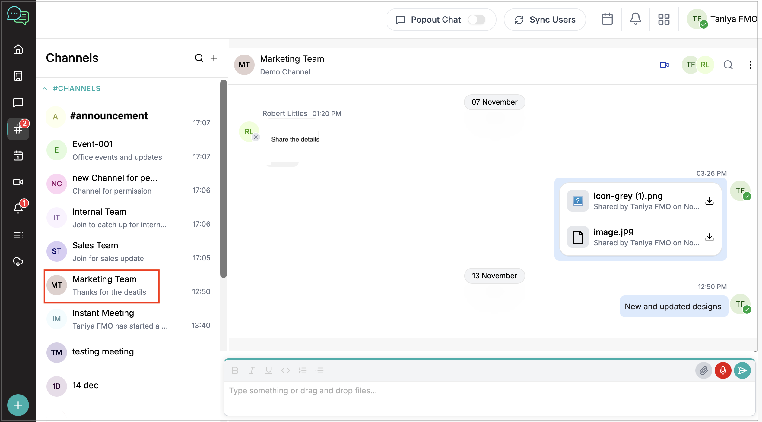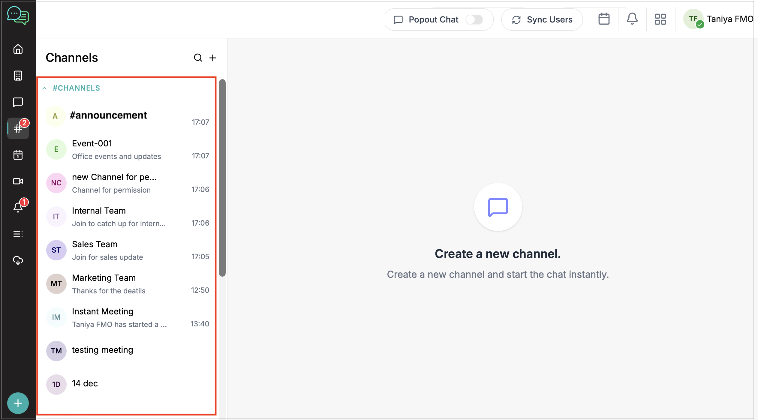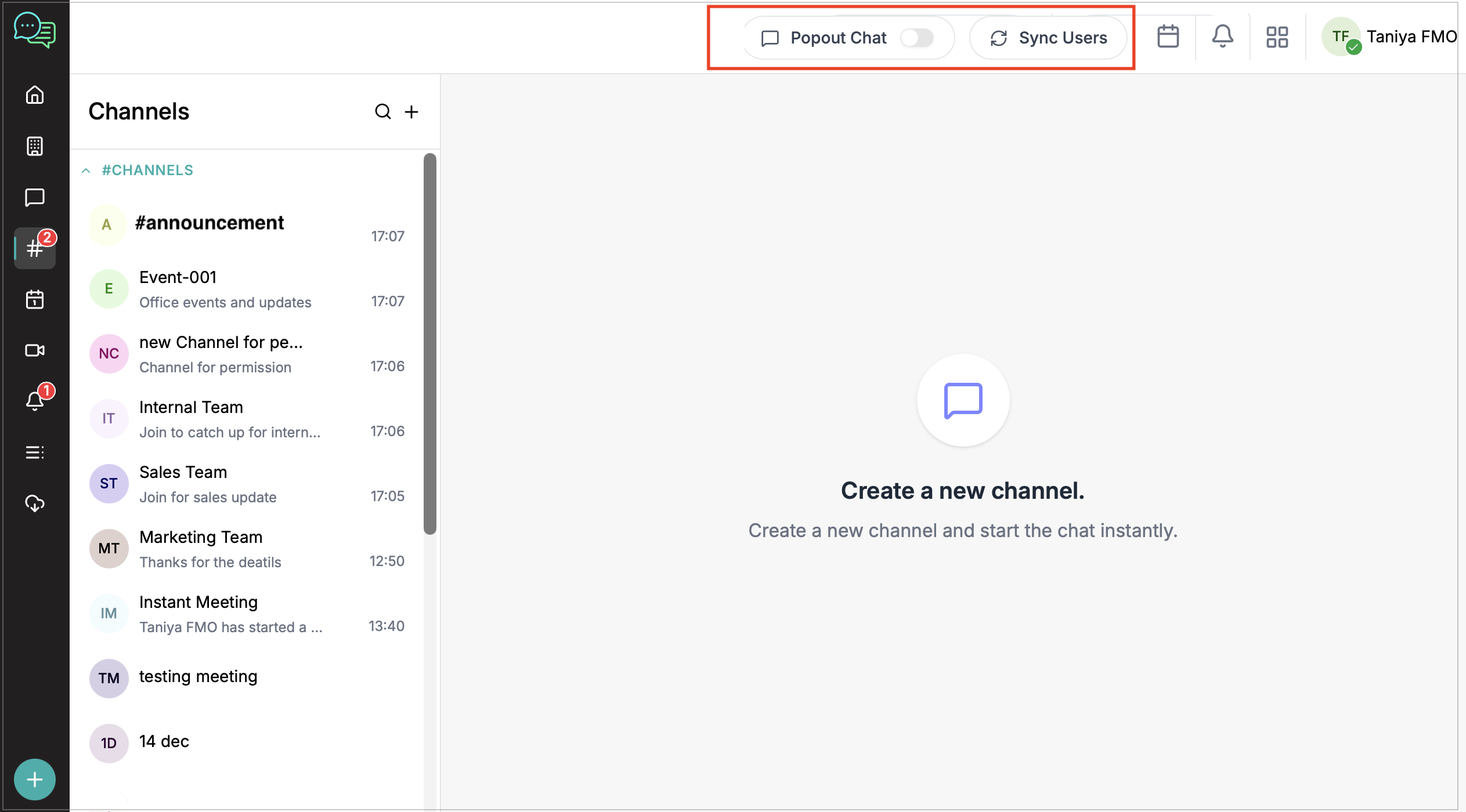 At the top of the screen, use Popout Chat to open chats in a separate window and Sync Users to refresh user and channel information.