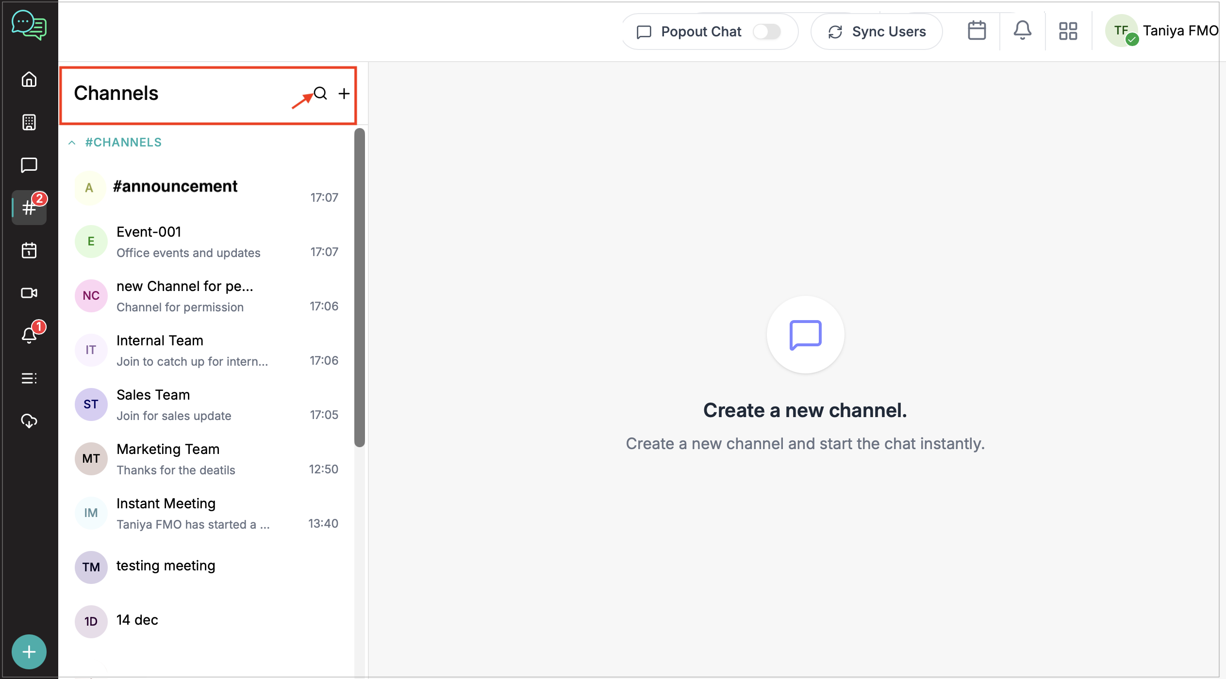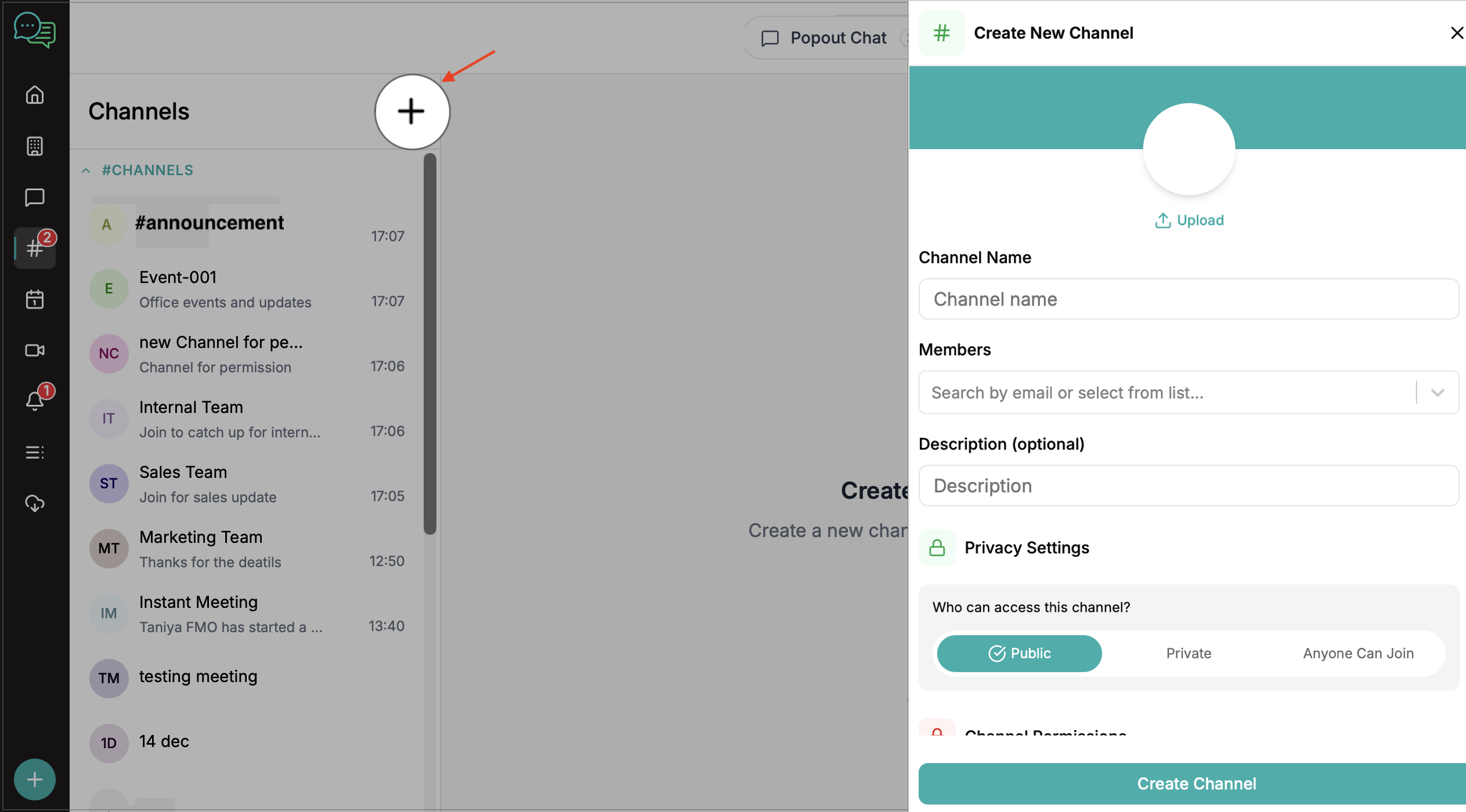 In the Channels panel header, click the plus (+) icon or the “Create a new channel” prompt in the main area.