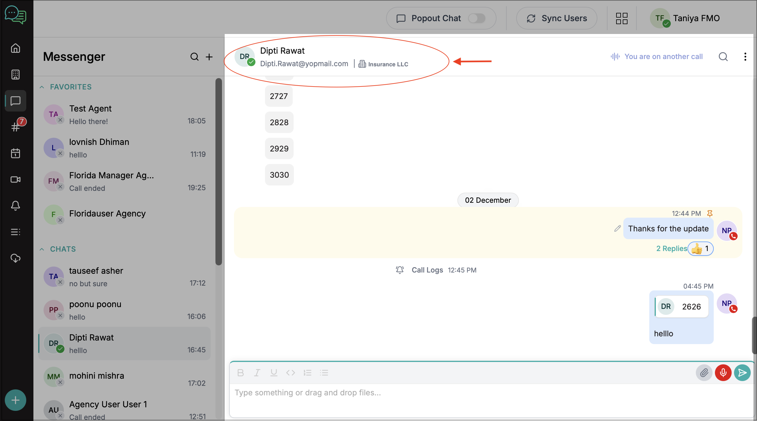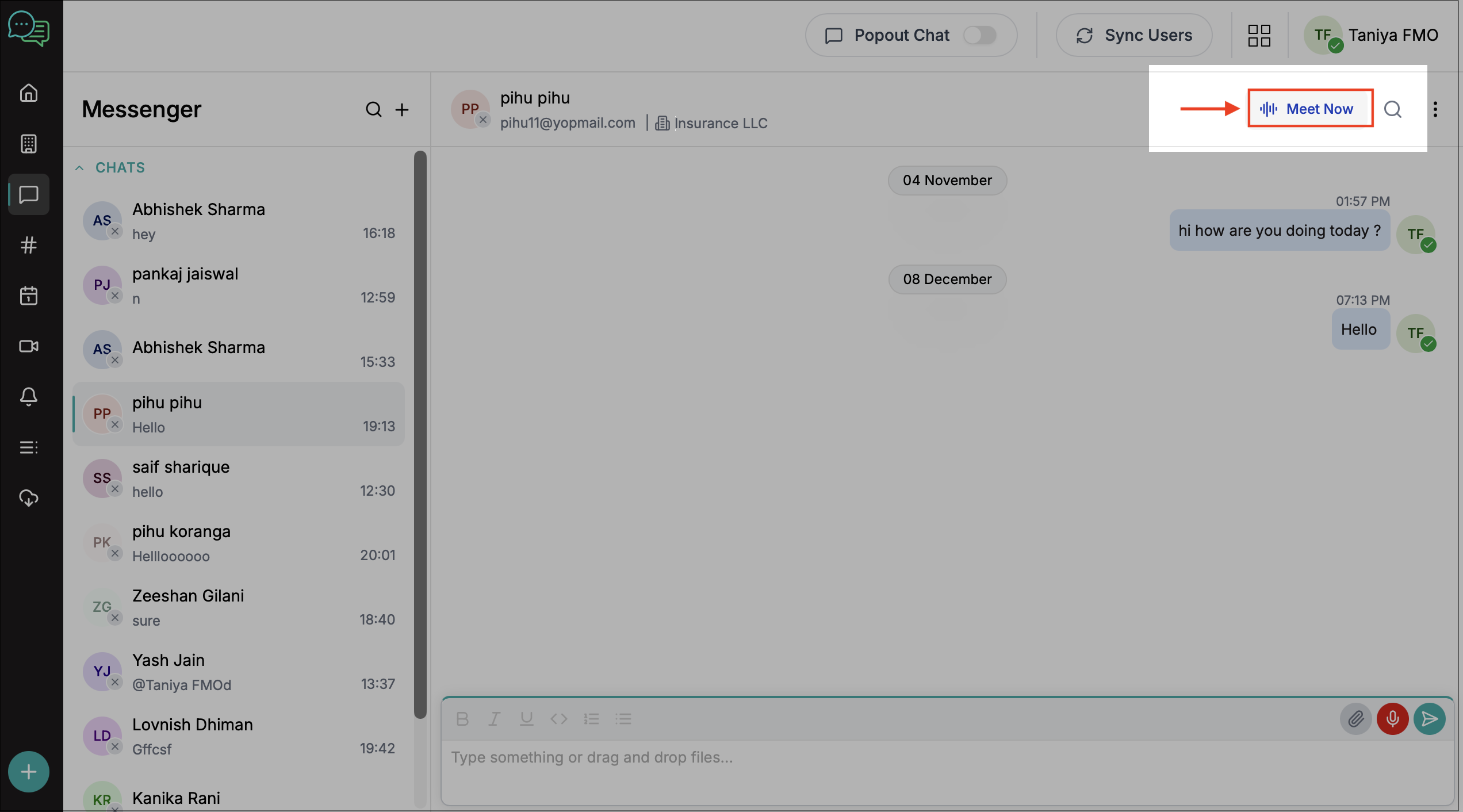 Use the Meet Now option on the top-right to start a video meeting with the selected user.