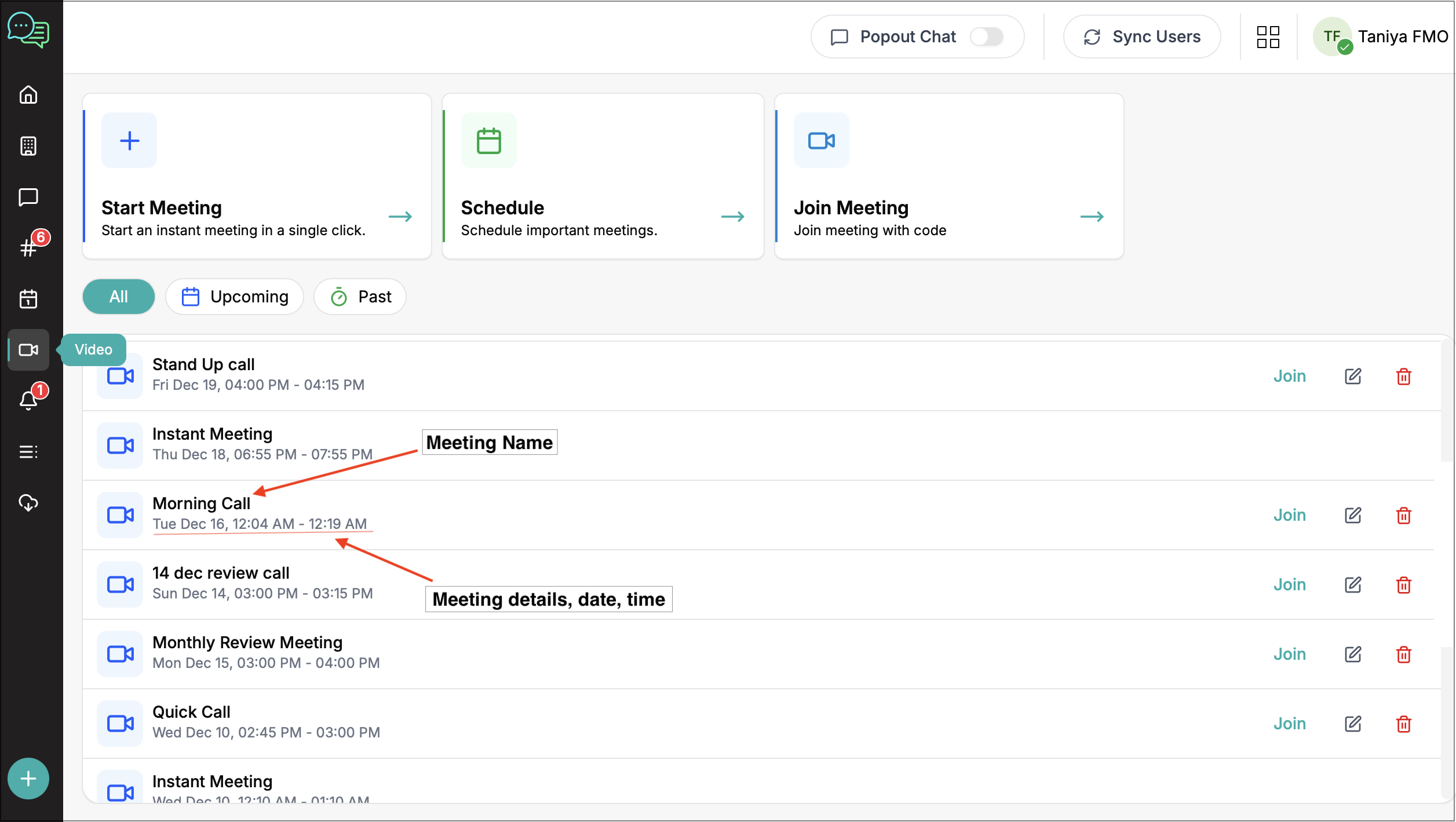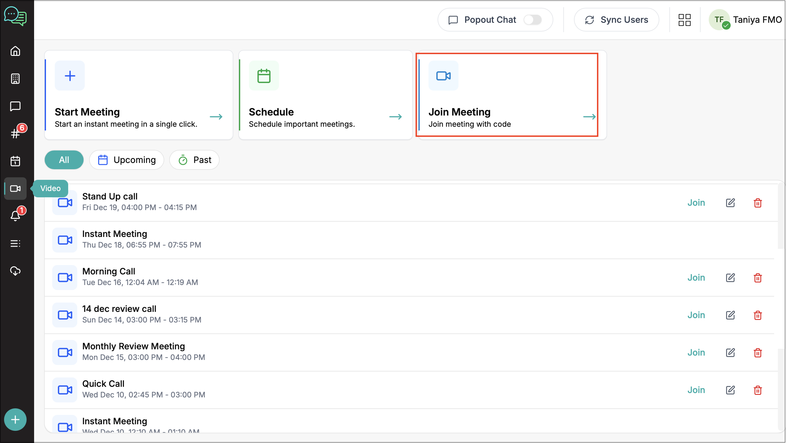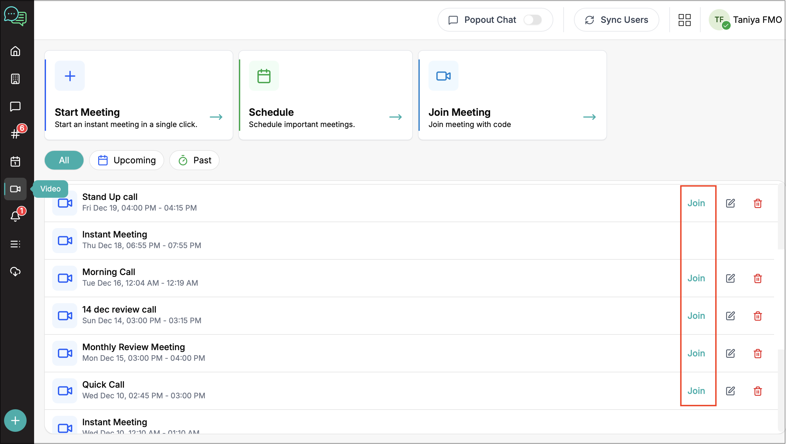From the left navigation bar, click the Meetings icon (camera symbol) to open the Meetings section. This step is important because it takes you directly to the area where all meeting-related actions are available.