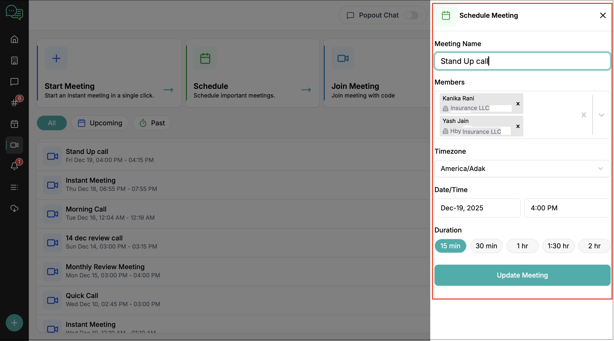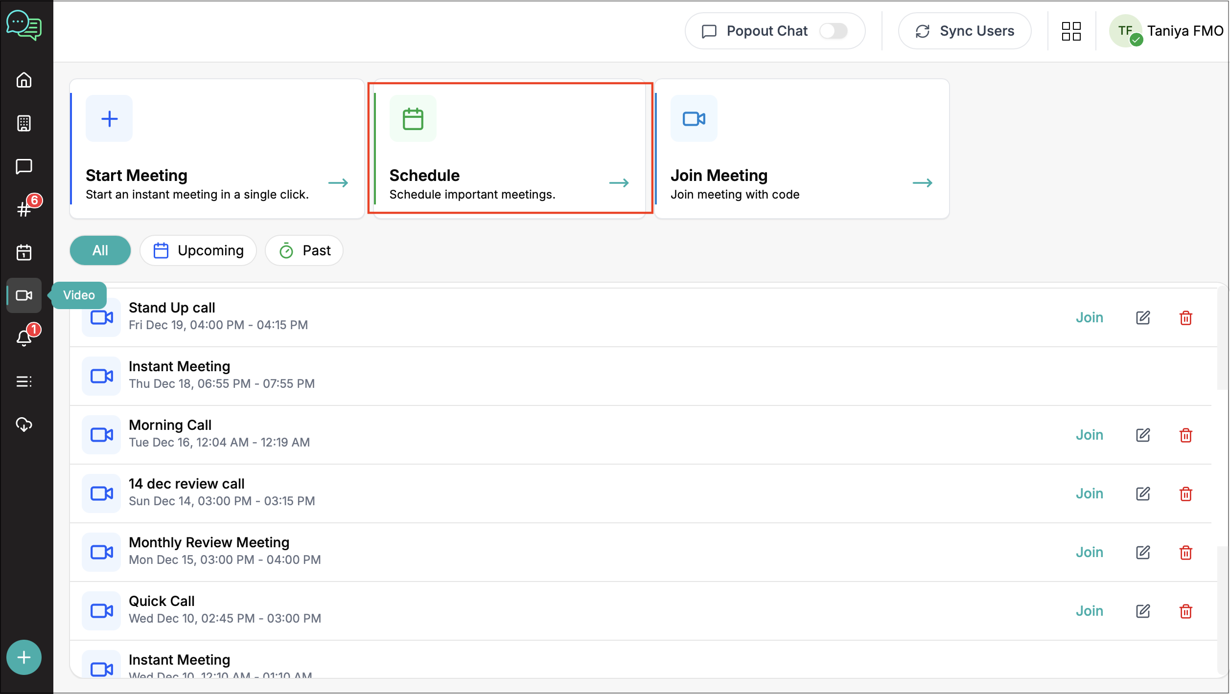 At the top-left, select the Start Meeting card and click the plus icon to launch a meeting immediately. Starting an instant meeting is useful when you need a quick ad-hoc discussion without prior scheduling.